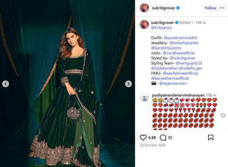 IMAGE: Emerald velvet, neck-to-hem drama and a matching dupatta that moves like poetry -- Kriti Sanon’s anarkali is winter weddings #goals. Photograph: Kind courtesy Kriti Sanon/Instagram