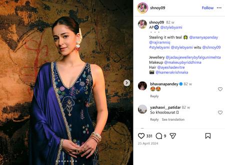 IMAGE: Ananya Panday’s velvet sleeveless salwar suit with intricate embroidery and a silk dupatta is what you'll be looking for when you want to look festive without piling on the layers. Photograph: Kind courtesy Ananya Panday/Instagram