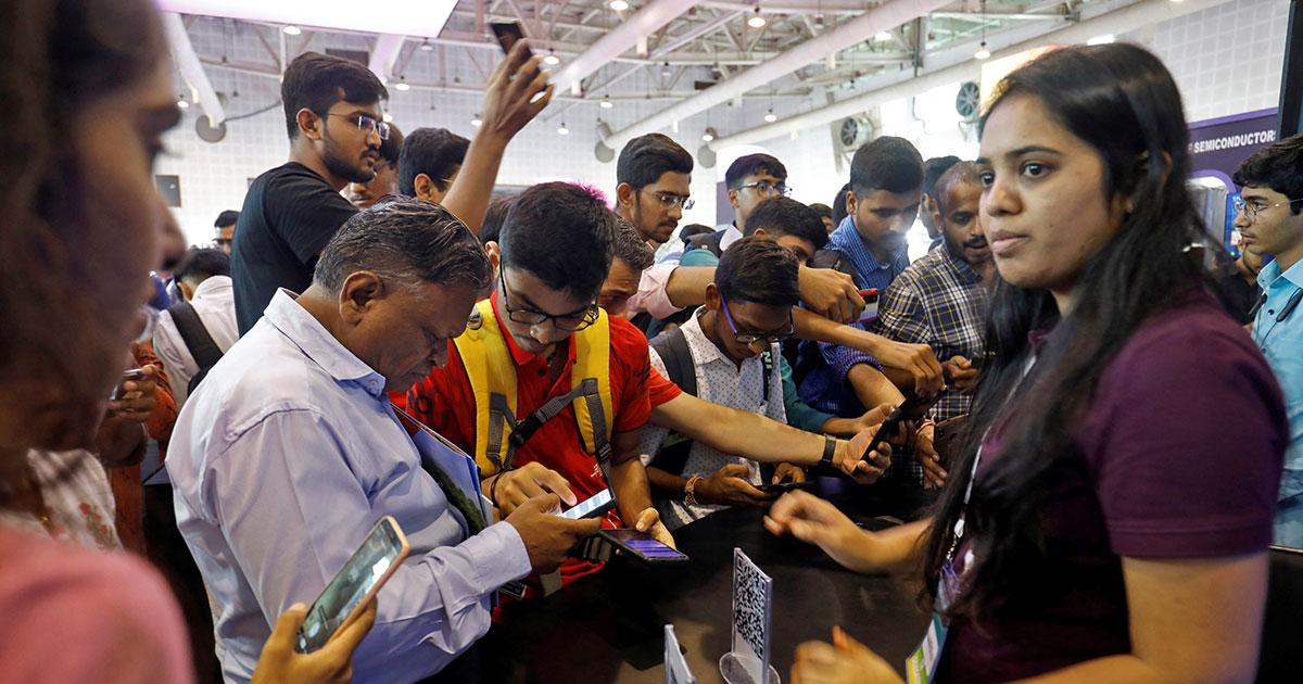 Job seekers scan a QR code to register themselves at a Micron Technology kiosk at SemiconIndia 2023, India's annual semiconductor conference, in Gandhinagar. Photograph: Amit Dave/Reuters