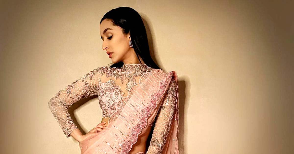 IMAGE: Shraddha Kapoor slayed in a pink sari paired with a see-through turtleneck blouse.