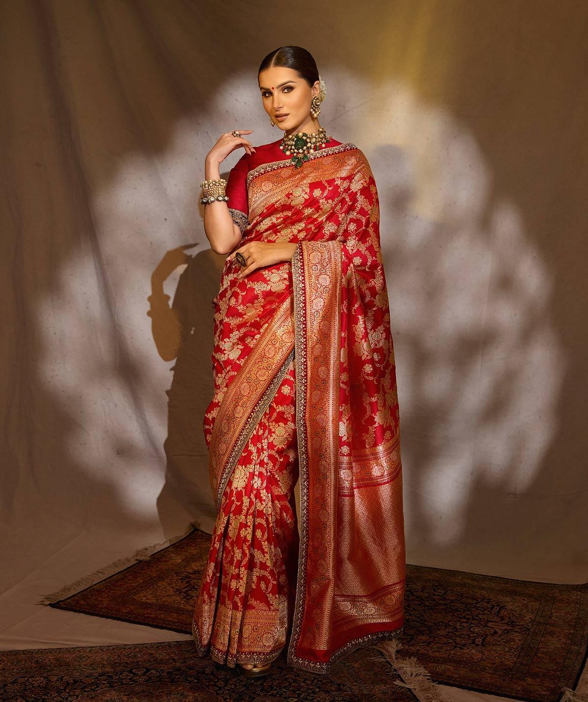 IMAGE: Tara’s red Banarasi sari with a boat-neck blouse, green kundan choker and gajra is effortless old-school glam, perfect for wedding-day moments when you want to look rich without going overboard. All photographs: Kind courtesy Tara Sutaria/Instagram