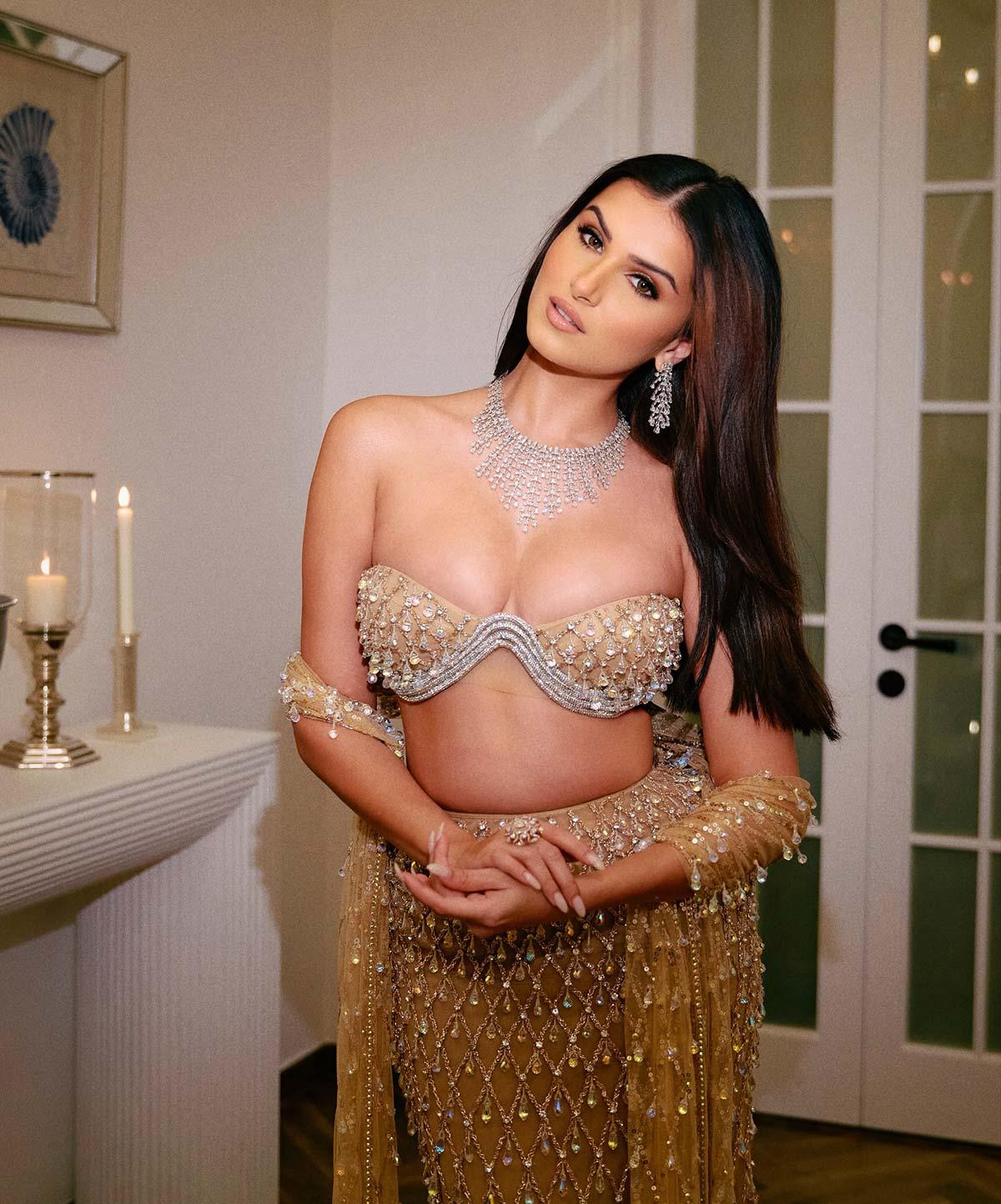 IMAGE: She shines in a champagne gold Indo-western lehenga skirt and bralette, completely drenched in tassels for that swishy, dance-all-night energy. It's the kind of look that works best for sangeet nights when you want movement in every step.
