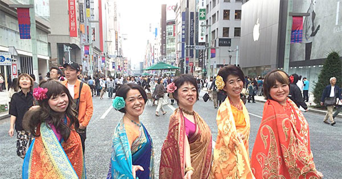 They stood in the middle of the street (the main streets in Ginza are closed to traffic on Sundays), holding their pallus on their left shoulders with smiles on their faces as if they were about to break into a Bollywood song.