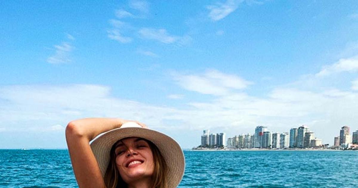 The model soaking up the sun on a beach in Galapagos Islands, Ecuador.