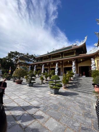 IMAGE: The Linh Ứng pagoda in Da Nang, with its main temple, bonsai trees, and stone courtyard.