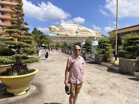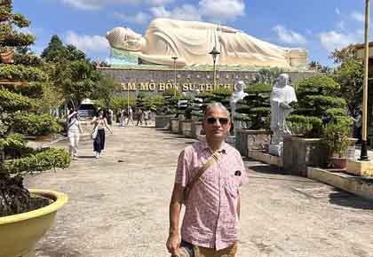 IMAGE: Nitin Sathe at the Vinh Trang pagoda in My Tho, Vietnam, with the reclining Buddha in the background. The pagoda blends Asian and European architectural styles and is a popular tourist spot in the Mekong Delta. All photographs and videos: Air Commodore Nitin Sathe (Retd)