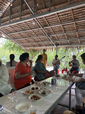 IMAGE: A group of people dine at a restaurant in Vietnam. The restaurant has a thatched roof and a musician plays a stringed instrument.