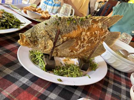 IMAGE: Deep-fried Elephant Ear Fish, a popular dish in the Mekong Delta, served on a white plate with fresh herbs.