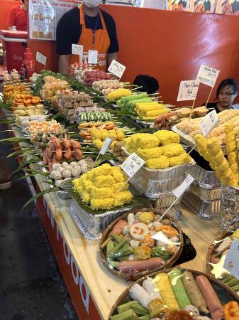 IMAGE: A street food vendor in Vietnam selling Nem chua rán (fried fermented pork sausage) and other snacks on skewers. Street food is a lively part of Vietnamese culture.