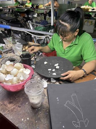 IMAGE: A woman creates lacquerware art using small pieces of eggshells. This traditional craft involves layering lacquer and carefully placing the eggshells to form detailed designs, showcasing a skillful and intricate process.