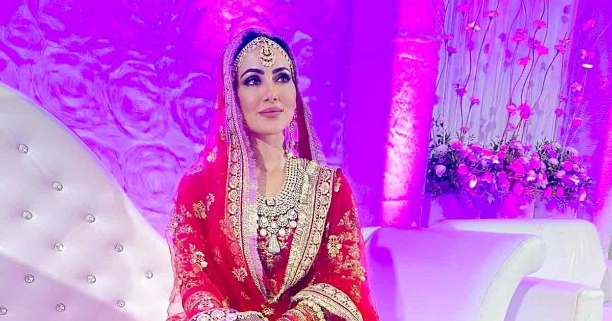 Posing with mehendi on her hands, Sana looked drop-dead gorgeous in her custom-made lehenga. Please scroll down to see the pics.