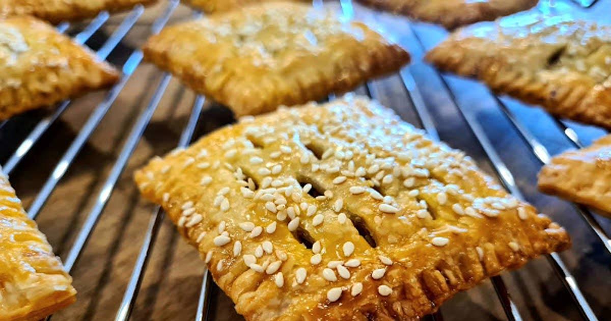 Brush the squares with the egg and sprinkle few sesame seeds on top.