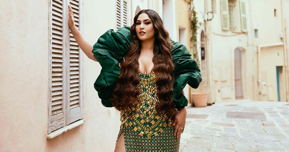 IMAGE: Sakshi Sindwani's Cleopatra-inspired Byzantine outfit was handcrafted over seven days with intricate metallic beads, amber stones, emeralds, sequins and an OTT ruffled cape.