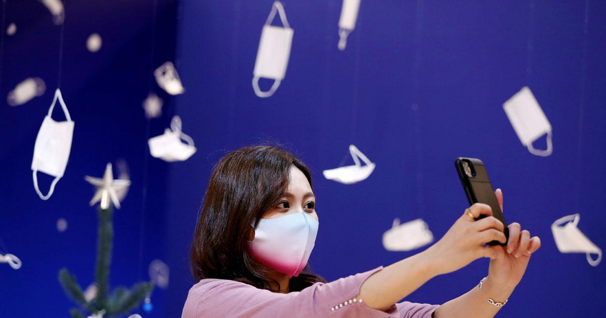 IMAGE: Wearing a dual-tone face mask, a woman takes a selfie in front of a photo spot featuring a Christmas scene. All photographs: Issei Kato/Reuters