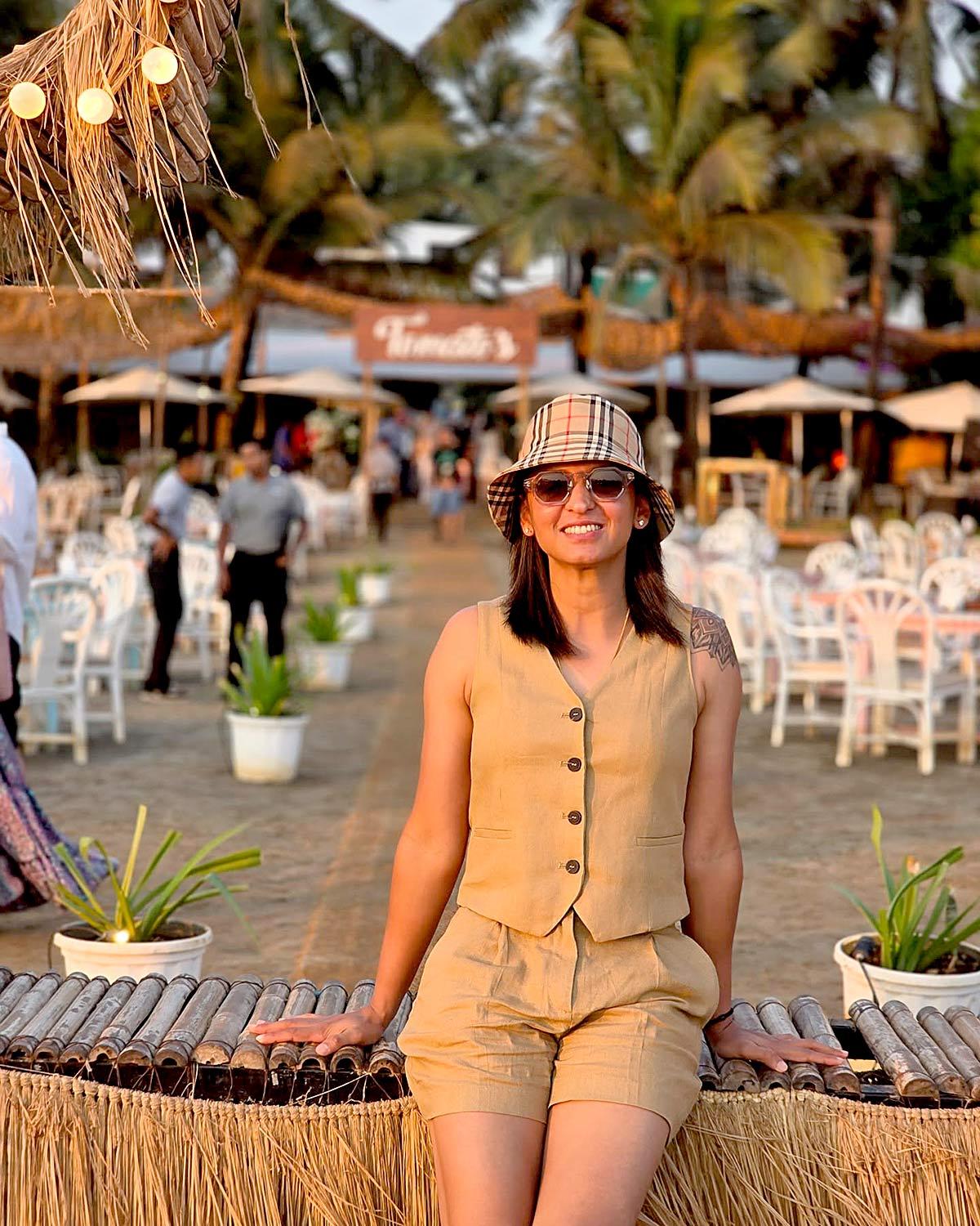 IMAGE: Harmanpreet switches from captain mode to vacay mode in a beige co-ord set with a vest and shorts, topped off with a Burberry hat. All photographs: Kind courtesy Harmanpreet Kaur/Instagram