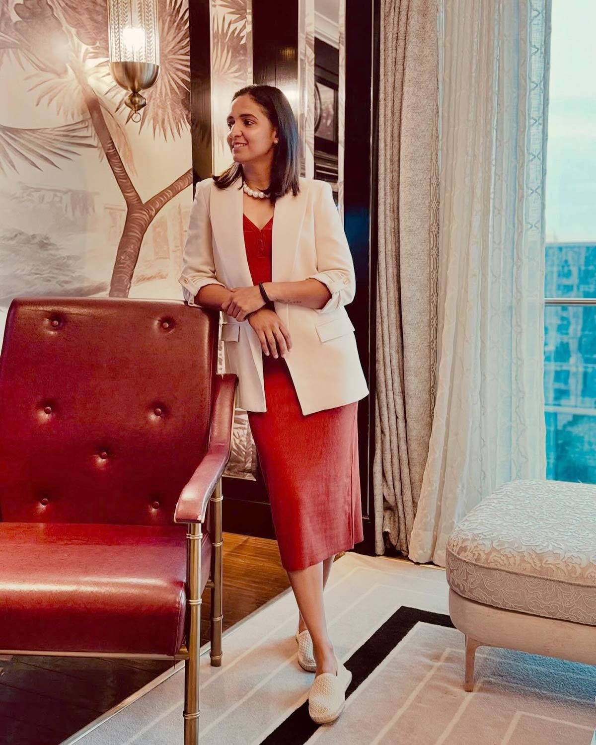 IMAGE: Harmanpreet could totally pass for a fashion editor in a red midi layered with a beige blazer and styled with a pearl necklace.