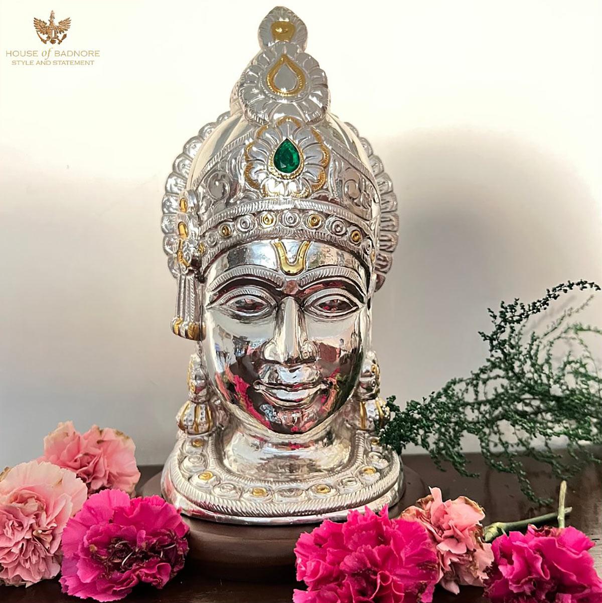House of Badnore's teak wood sculpture of Vishnu clad in pure 999 silver and embellished with 24k gold and semi-precious stones.