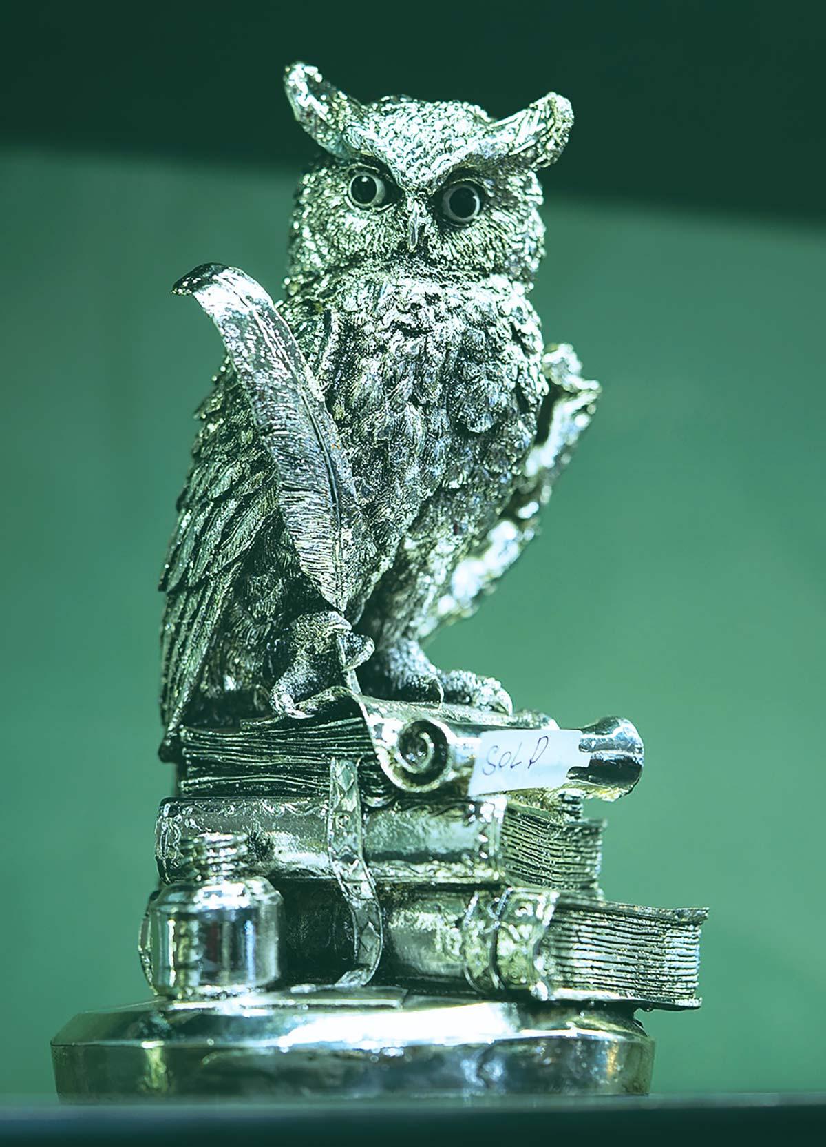 Sculpted in sterling silver, the owl, considered the vaahan (vehicle) of Lakshmi, makes a statement piece.