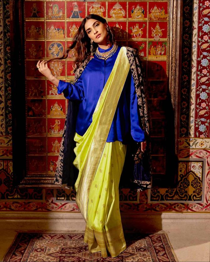 IMAGE: Sonam Kapoor bid adieu to the regular blouse and draped a lemon yellow silk sari with an oversized royal blue satin shirt and a printed shawl worn like a cape. The untucked, relaxed shirt is what made the fusion ensemble look unique. Photograph: Kind courtesy Sonam Kapoor/Instagram