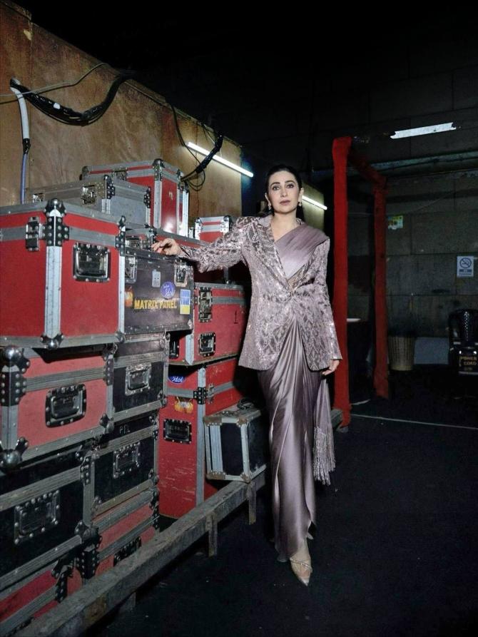 IMAGE: Karisma Kapoor went for a satin lilac sari worn inside a blazer, literally draping the pallu within the jacket. It created a structured, sculpted silhouette that felt more like a dress than a traditional sari. Photograph: Kind courtesy Karisma Kapoor/Instagram