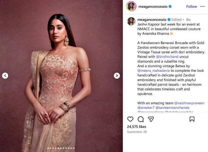 IMAGE: Janhvi Kapoor took a handwoven Banarasi brocade corset with gold zardozi and draped her vintage tissue sari from behind, letting the corset shine front and centre. No hiding that blouse! This year, the blouse became the hero and hence the sari was draped differently. Photograph: Kind courtesy Janhvi Kapoor/Instagram