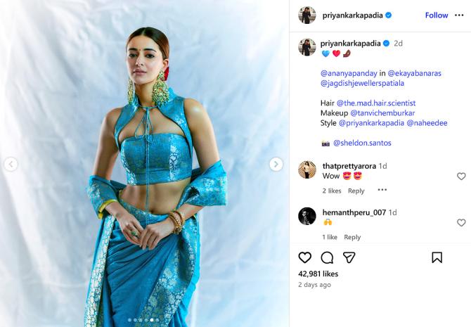 IMAGE: Ananya Panday reimagined the Banarasi in a turquoise drape worn like a dupatta around her arms instead of the usual shoulder pallu. Add to that a mandarin collar blouse and the sari suddenly felt futuristic. Photograph: Kind courtesy Ananya Panday/Instagram