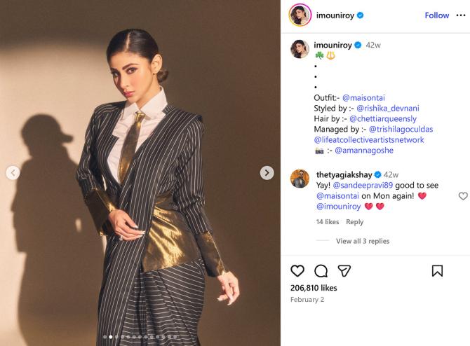 IMAGE: Kanjeevaram went corporate-cool as Mouni Roy styled a wool-blend navy pinstripe sari with a matching blazer, white shirt and gold silk tie. She turned the sari into a power suit without losing its cultural soul. Photograph: Kind courtesy Mouni Roy/Instagram