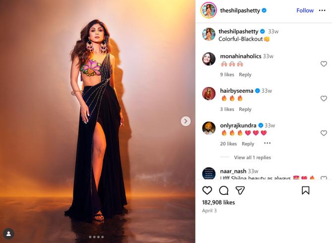 IMAGE: Saris with slits officially had their moment in 2025. Shilpa Shetty chose a black sari with a thigh-high slit, thin pallu and floral blouse and the sari suddenly felt… hot. Photograph: Kind courtesy Shilpa Shetty/Instagram