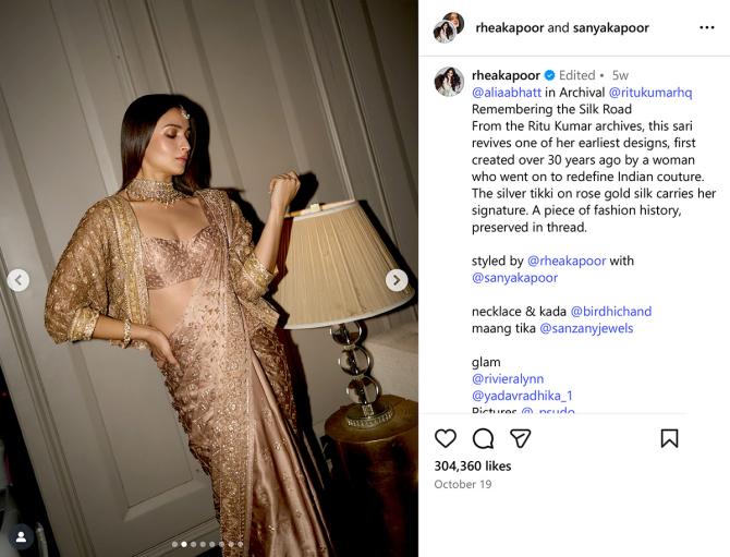 IMAGE: Alia Bhatt wore a Ritu Kumar sari created over 30 years ago, proving that vintage doesn’t mean dated. She layered it with a matching shrug, another big trend this year. Photograph: Kind courtesy Rhea Kapoor/Instagram