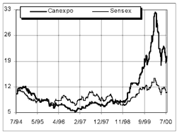 Over the trailing three-year period ending July 31, 2000 the fund has given an annualised return of 35.31%, which is in line with top performing diversified equity funds during the period. Over the period the fund has increasingly become over-weight on technology stocks, with an allocation of 40 percent in early 1999 to a high as 60 percent in the June 2000. In July, Canexpo has reduced its exposure in favour of pharmaceutical and consumer stocks. Its sector concentration apart, the fund has consistently been overweight on its top holding -- Infosys Technologies, which has registered handsome gains over the years. As on July 31, 2000 Infosys accounts for almost 40 per cent of the portfolio.