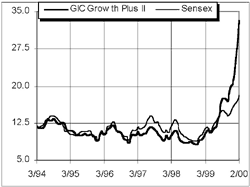 Performance The scheme has posted an annualised return of 20.45 per cent since inception as opposed to the Sensex return of 3.84 per cent. In the last six months, the fund has declared two dividends - 30 per cent in October 1999 and 15 per cent in January 2000. While it was struggling to just about keep pace with the Sensex in the initial years, the scheme has witnessed a turnaround from last July, and consistently outperformed the market since then. In the last year ending February 2000, while the Sensex returned 60.22 per cent, the scheme has returned 211 per cent. The scheme has a concentrated portfolio and the top 15 holdings account for nearly 85 per cent of the corpus. There has been rapid portfolio churning in the last six months in favour of the infotech sector, up to 32 per cent of the fund size, and this explains the turnaround. Other key sectors of the fund include banks, FMCG and telecom, in that order. Outlook GIC Growth Plus II is well-diversified across quality new and old economy stocks. The fund is an attractive long-term investment for its diversified portfolio, and its pricing policy discourages short-term investors from the fund.