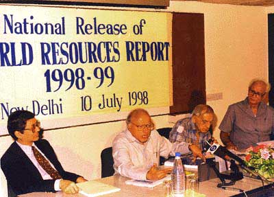 | Participants at the India launch of "World Resources Report 1998-99" included: S P Godrej (President, WWF-India, third from left); Dr A Karim Ahmed (WRI, far left); Dr M S Swaminathan (agricultural scientist, second from left) and Samar Singh (Secretary-General of WWF-India, right). Back << |