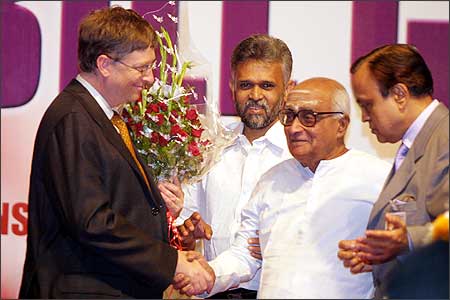 The Executive Secretary and Director General of the Bharatiya Vidya Bhavan, S Ramakrishnan, gave a bouquet to Gates, the world's richest man. Photograph: Jewella C Miranda