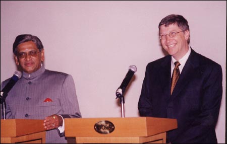 S M Krishna and Gates addressed a press conference at the campus. Photograph: K Venkatesh