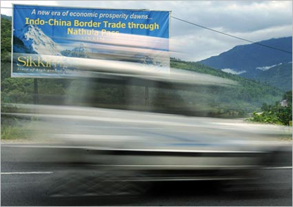 Photograph: A passenger vehicle makes its way through the hill tracks past a billboard on the proposed re-opening of the Nathu La Pass, the India-China border between Sikkim and Tibet, at Bardang, some 30 km south of Gangtok. Indian and Chinese officials finalised July 6, 2006 as the date for formal trading to begin at the 15,000 feet Nathu La Pass. Photograph: Deshkalyan Chowdhury/AFP/Getty Images