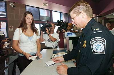 Image: A US government employee watches as her new visa card is passed over a radio sensor by a US Customs agent. The new visa card has an inbeded chip which uses a new radio frequency identification (RFID) technology to record the entries and exits of visitors crossing US land borders. | Photograph: Gary Williams/Getty Images