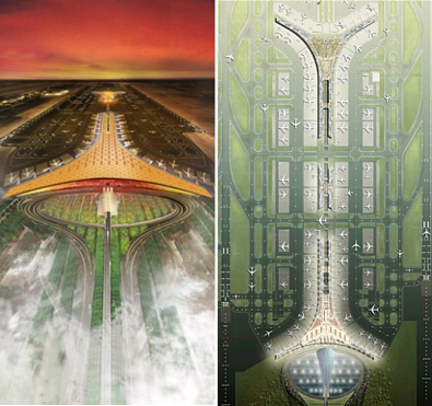 An artist's imagination of the top views of the dragon-shaped Terminal 3 of the Beijing Capital International Airport in Beijing, China.