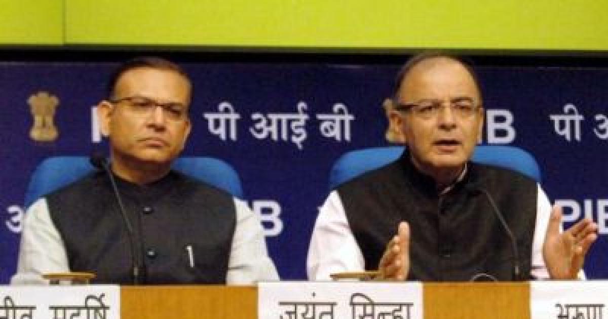 Image: Finance Minister Arun Jaitley addresses a post-Budget press conference in New Delhi on February 28, 2015. Minister of State for Finance Jayant Sinhait is to his right. Photograph: PIB.