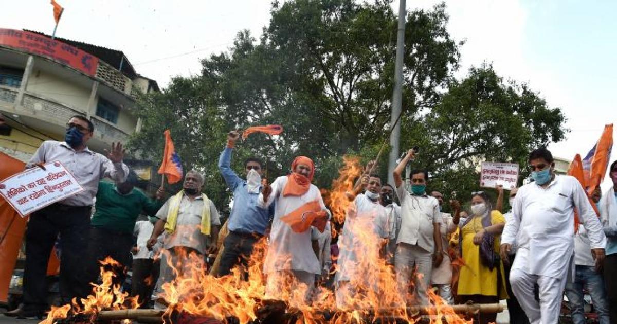 IMAGE: Bharatiya Mazdoor Sangh activists burn Chinese Communist party General Secretary Xi Jinping's effigy at a protest in New Delhi. Photograph: Manvender Vashist/PTI Photo