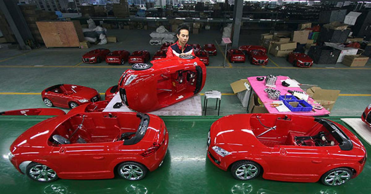 Image: A worker assembles toy cars at a production line inside a factory in Jinjiang, Fujian province, China. Photograph: China Daily/Reuters