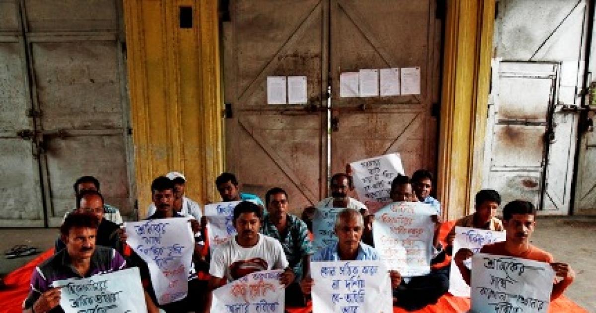 Image: Employees hold placards as they sit on a protest outside Hindustan Motors Ltd's Uttarpara plant near Kolkata. Photograph: Rupak De Chowdhuri/Reuters