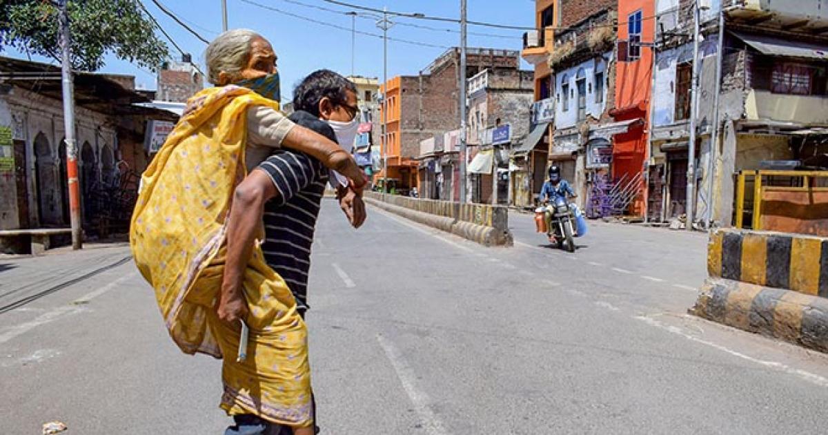 IMAGE: A man carries his mother as they cross a deserted road in Prayagraj, April 6, 2020.Photograph: PTI Photo