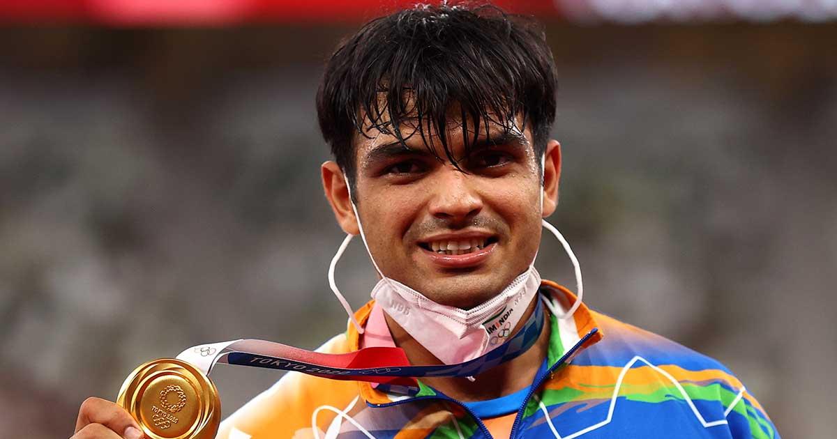 IMAGE: India's Gold medallist Neeraj Chopra on the podium at the Tokyo 2020 Olympics, August 7, 2021. Photograph: Andrew Boyers/Reuters