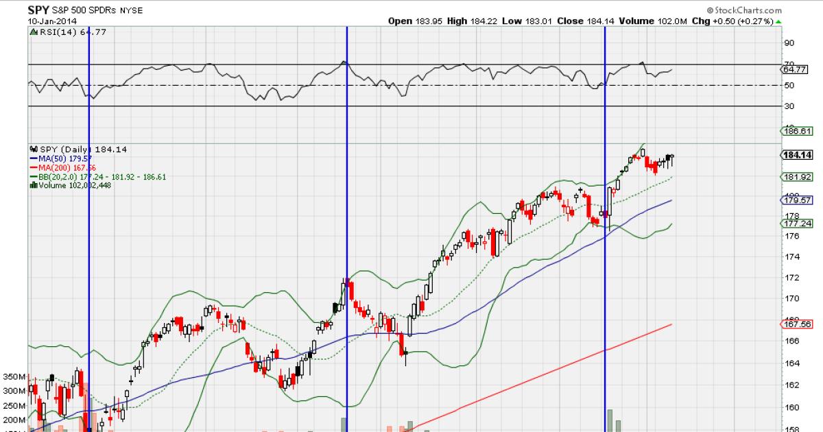 The SPY chart, the traded ETF of S&P 500, is shown here. S&P 500 closed Friday at 1842.37 and appears to be on its way up to retest the previous top at 1850. Incidentally, 1850 happens to be on a very important trend line running up from the low of March 2009, through the top in March 2012, to the top on December 31. The trend-line used to be a very important support line from March 2009 to August 2011, and has been a formidable resistance since then. Taking out the resistance would be a very rare but important technical event.