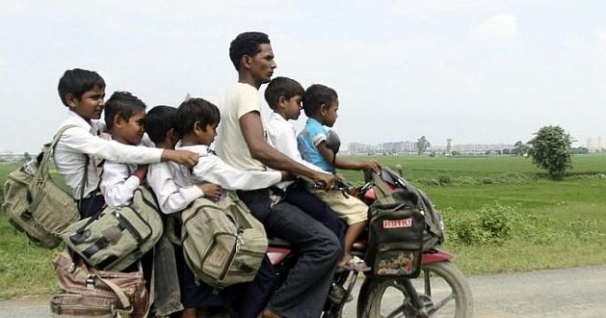 A man rides a motorcycle carrying six children on their way back home from school at Greater Noida, Uttar Pradesh.