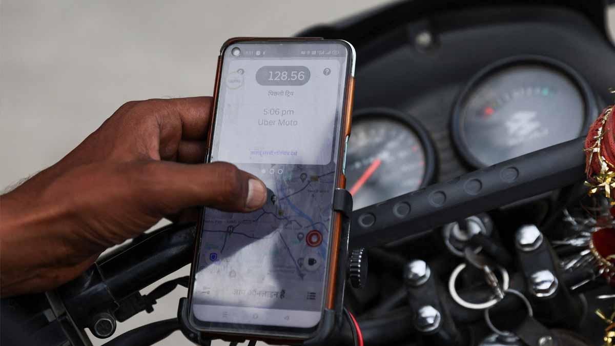 IMAGE: A motorbike driver uses the Uber mobile application for Uber Moto rides in New Delhi. Photograph: Anushree Fadnavis/Reuters