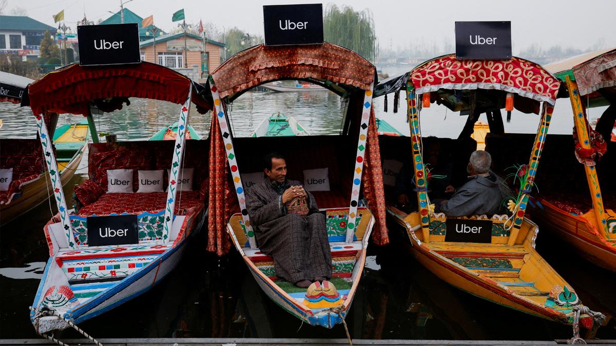 IMAGE: Uber signs are displayed on "shikaras" on the Dal Lake, Srinagar. Photograph: Sharafat Ali/Reuters