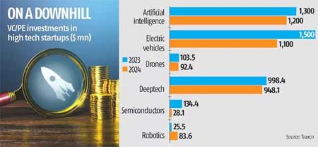 At a macro level VC/PE investments in these high-tech startups fell from $4.06 billion in 2023 to $3.45 billion in 2024 -- a drop of 15 per cent collectively -- according to data from Tracxn.