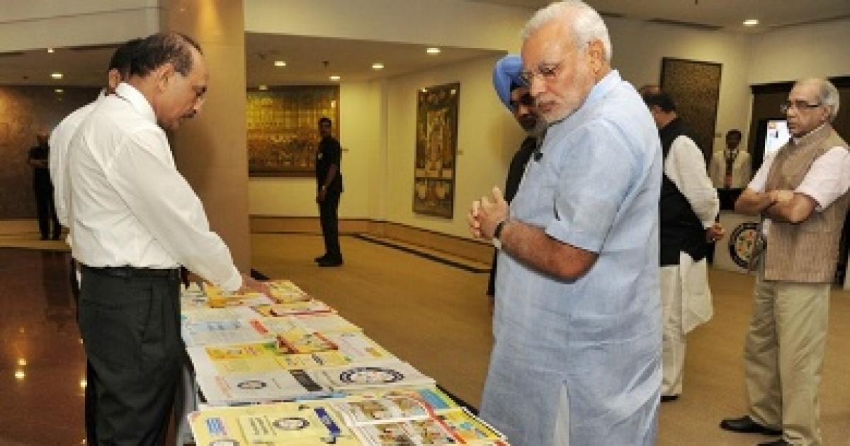 Image: Prime Minister Narendra Modi at the ‘Pradhan Mantri Jan Dhan Yojana launch -- at the Exhibition on Technology and Financial Literacy, in New Delhi. Photograph: Kind courtesy, Press Information Bureau