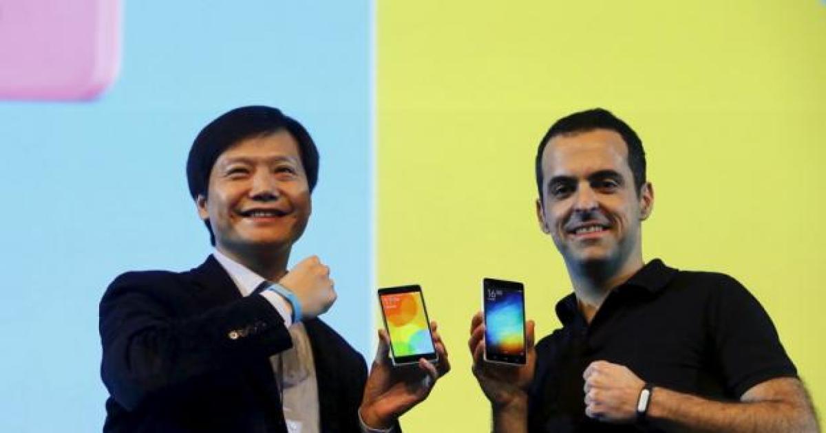 Image: Lei Jun (left), founder and chief executive officer of Xiaomi, and Hugo Barra, Xiaomi's vice president of international operations, display Mi 4i phones during its launch in New Delhi in May 2015. Photograph: Anindito Mukherjee/Reuters.